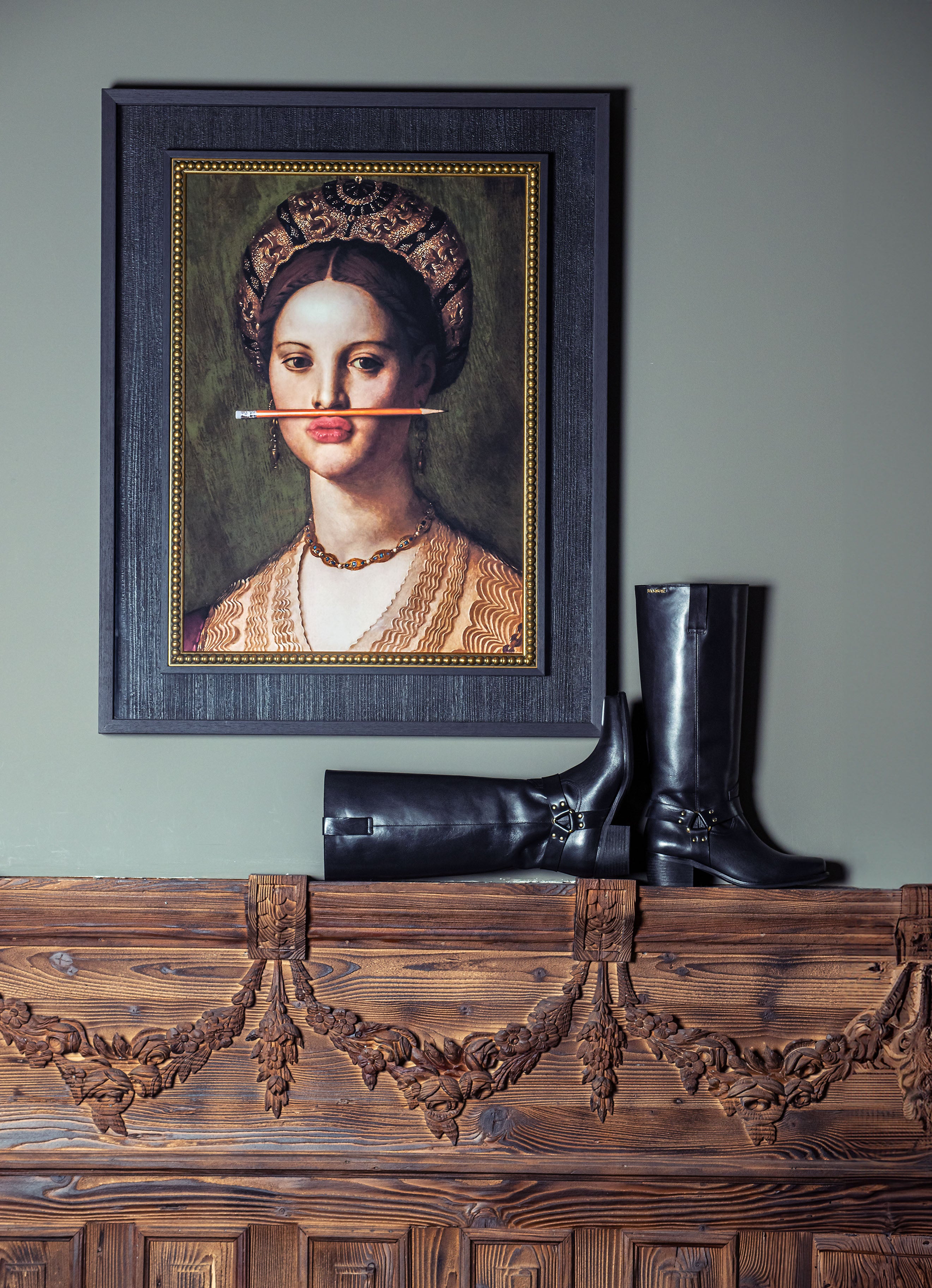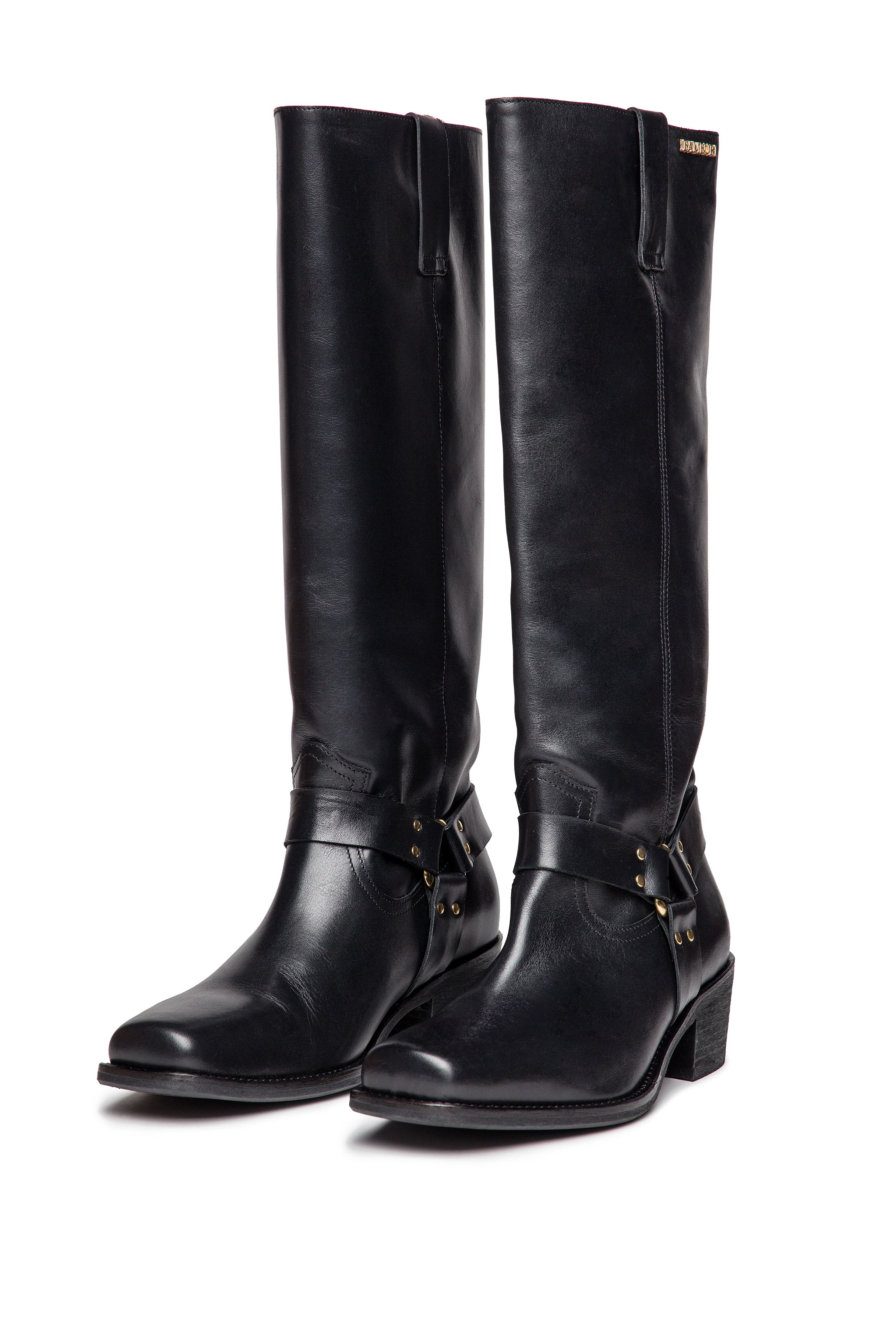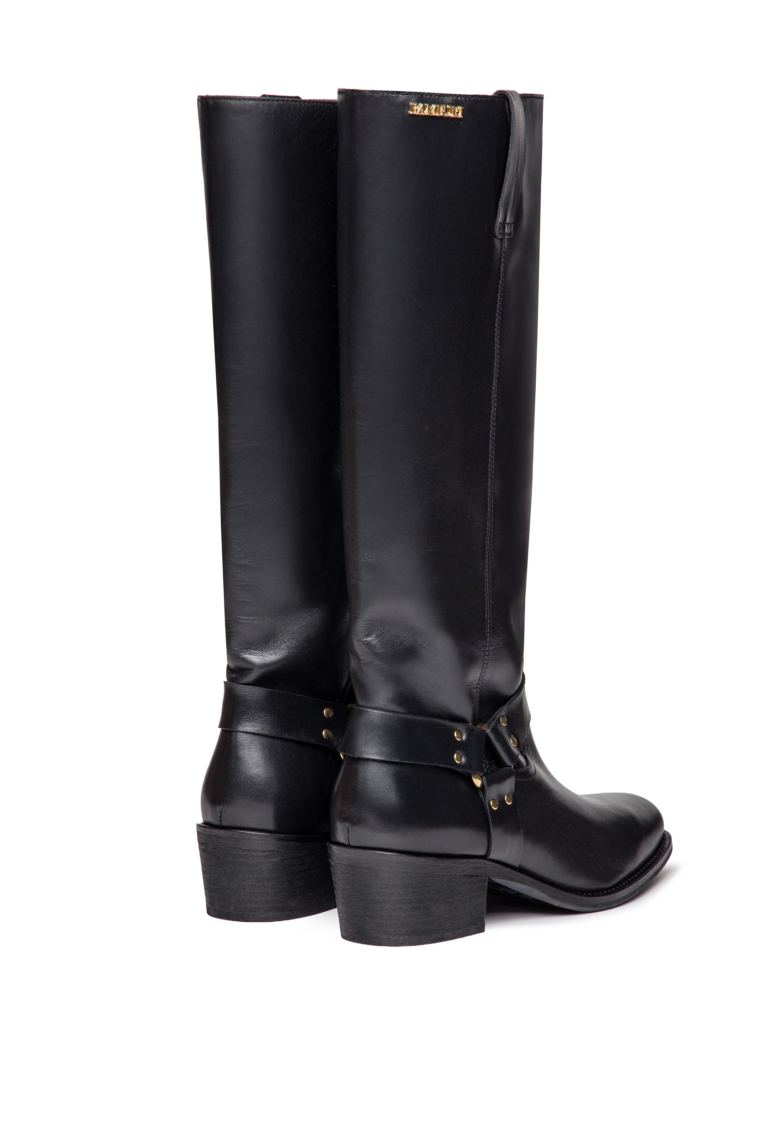 Tall black leather boots with a sleek western-inspired silhouette, square toe, and mid-block heel. Detailed with harness-style straps and brass-tone studs, they blend classic equestrian design with bold contemporary edge. A versatile staple to pair with everything from denim to tailored coats.