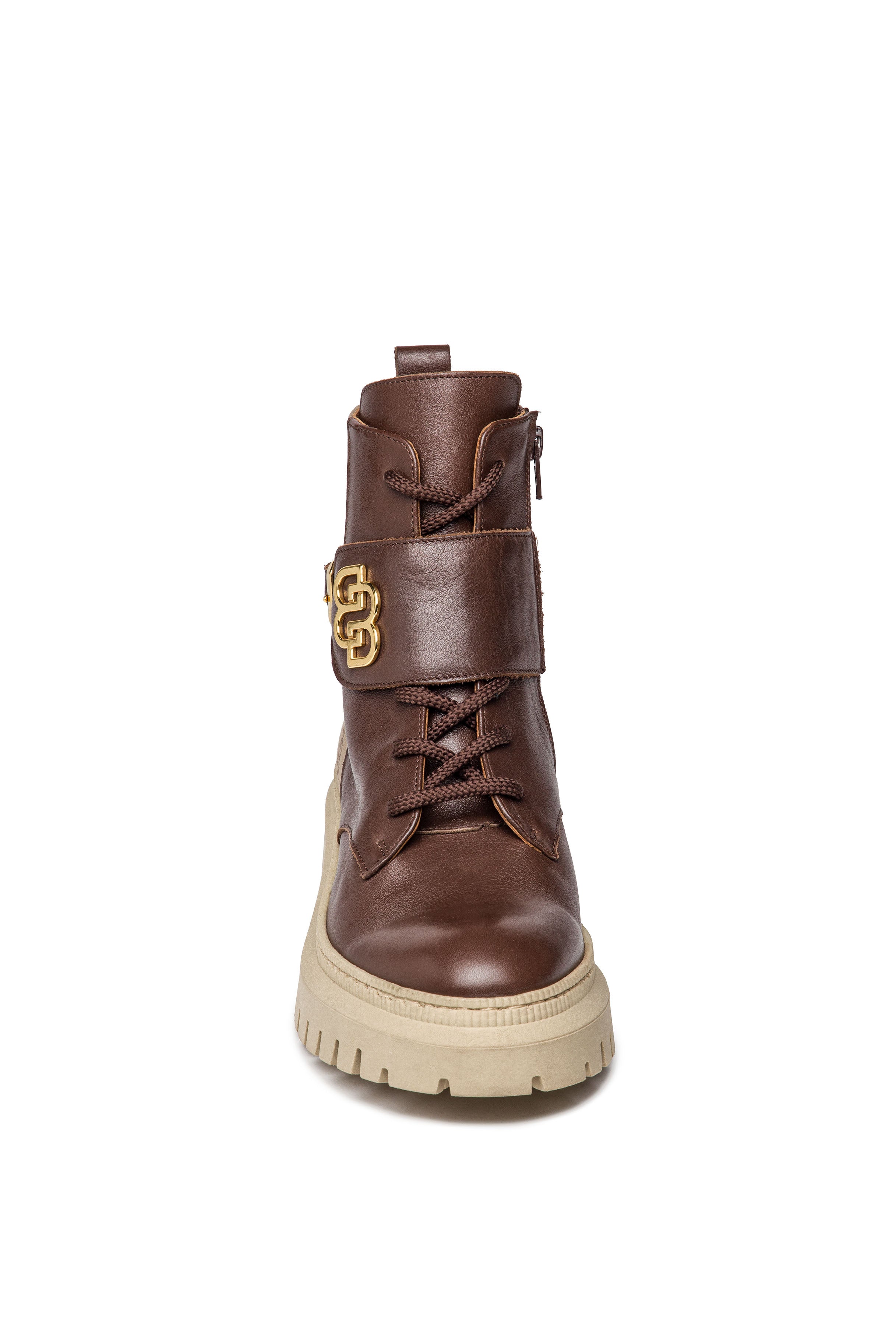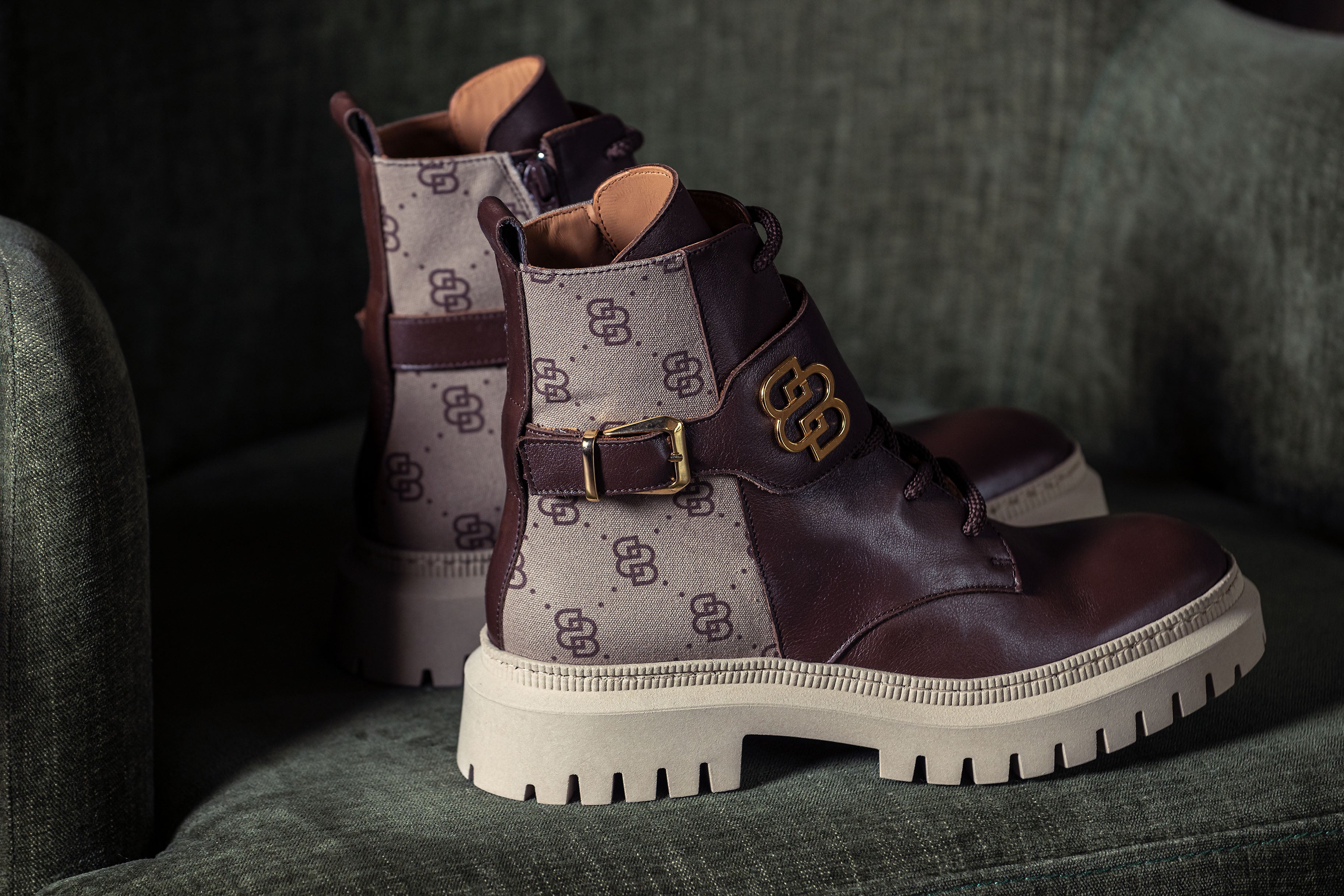 These combat-inspired boots combine smooth brown leather with our signature monogram canvas panels for a bold yet versatile look. The adjustable side strap with golden BB monogram hardware adds refinement, while the chunky beige sole ensures all-day comfort and durability. A modern statement piece that balances casual utility with elevated style.