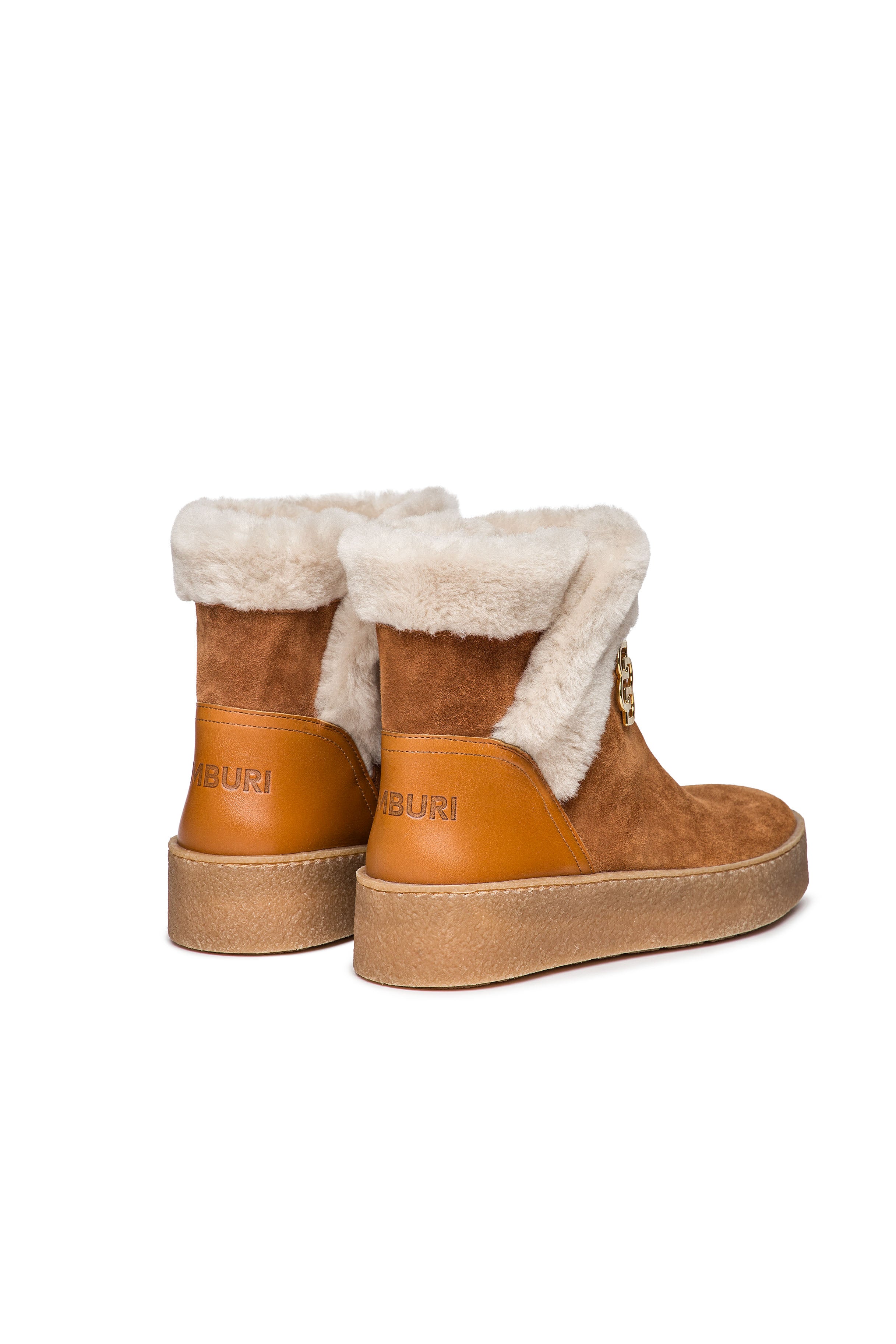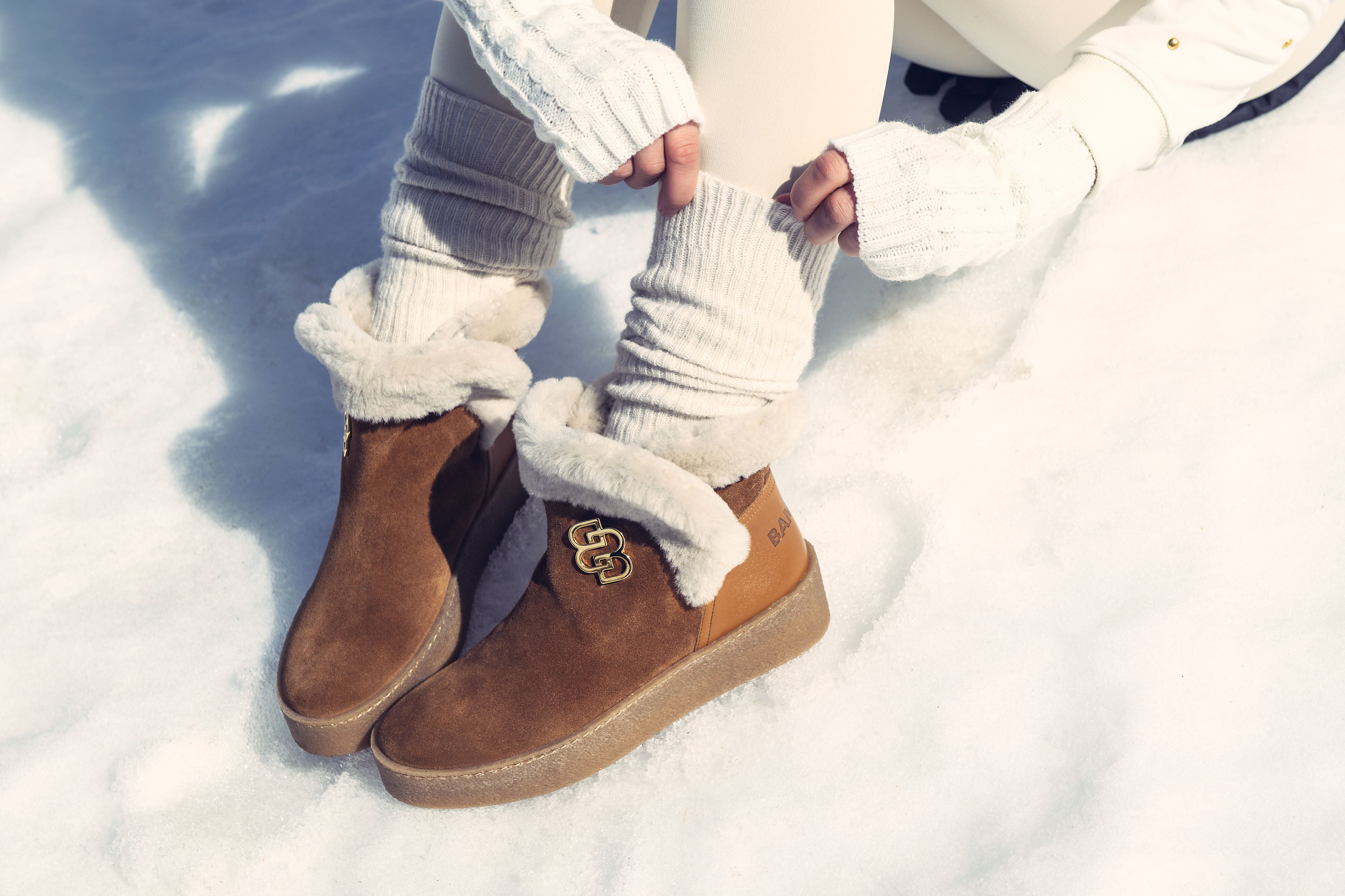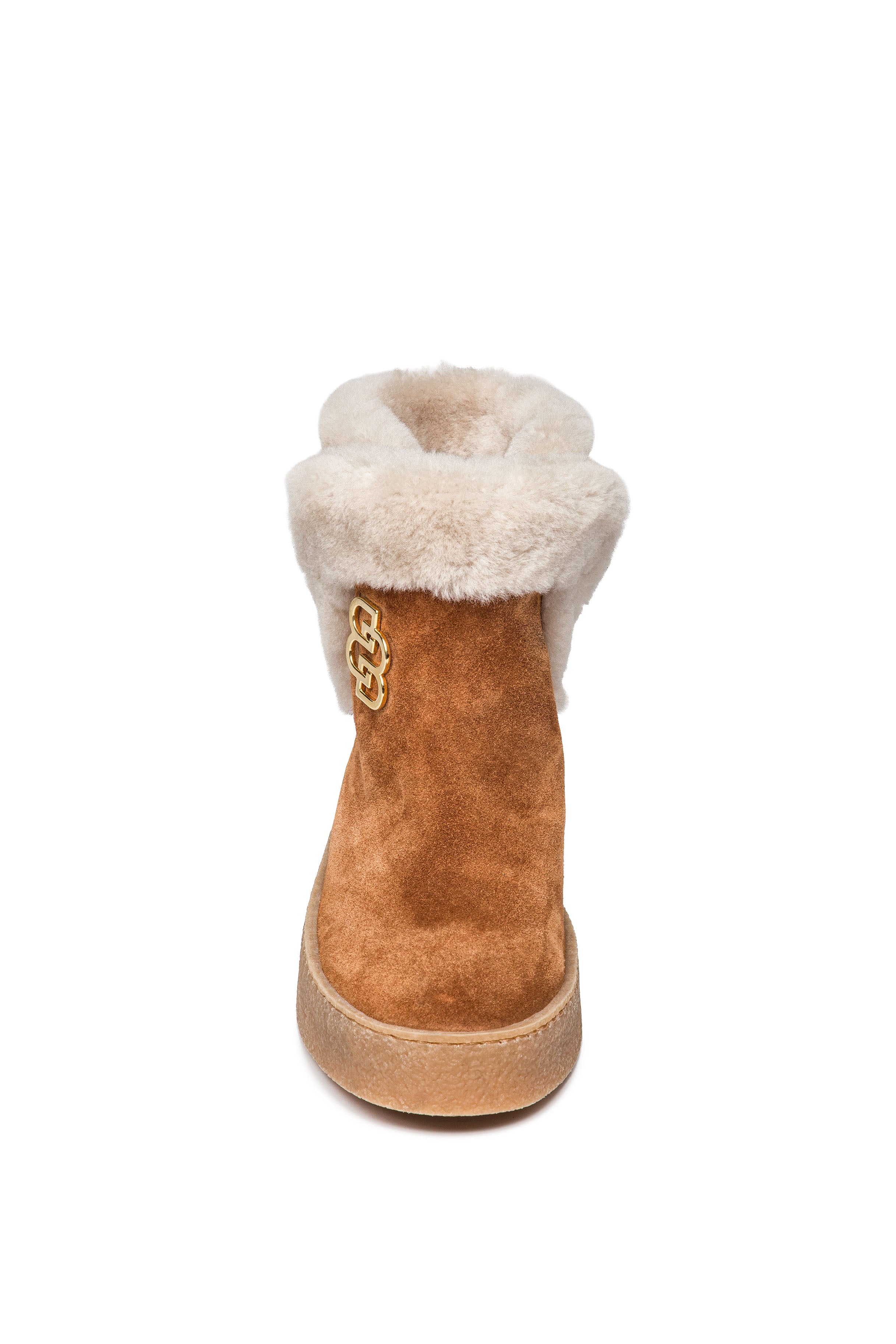 cozy winter statement in camel suede with plush shearling lining, finished with a tonal rubber sole and gold-tone BB emblem. Perfect for après-ski comfort or city strolls in style.