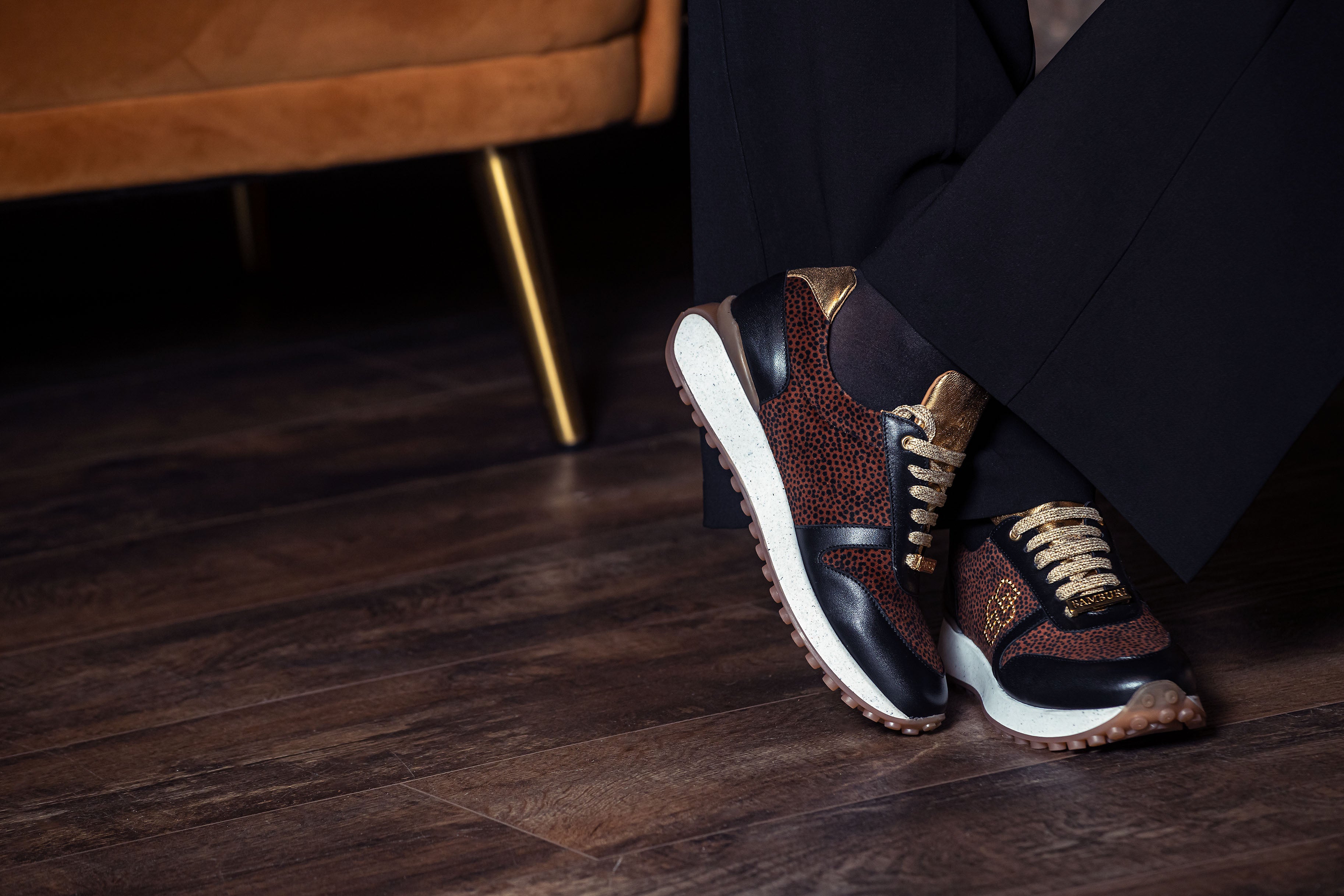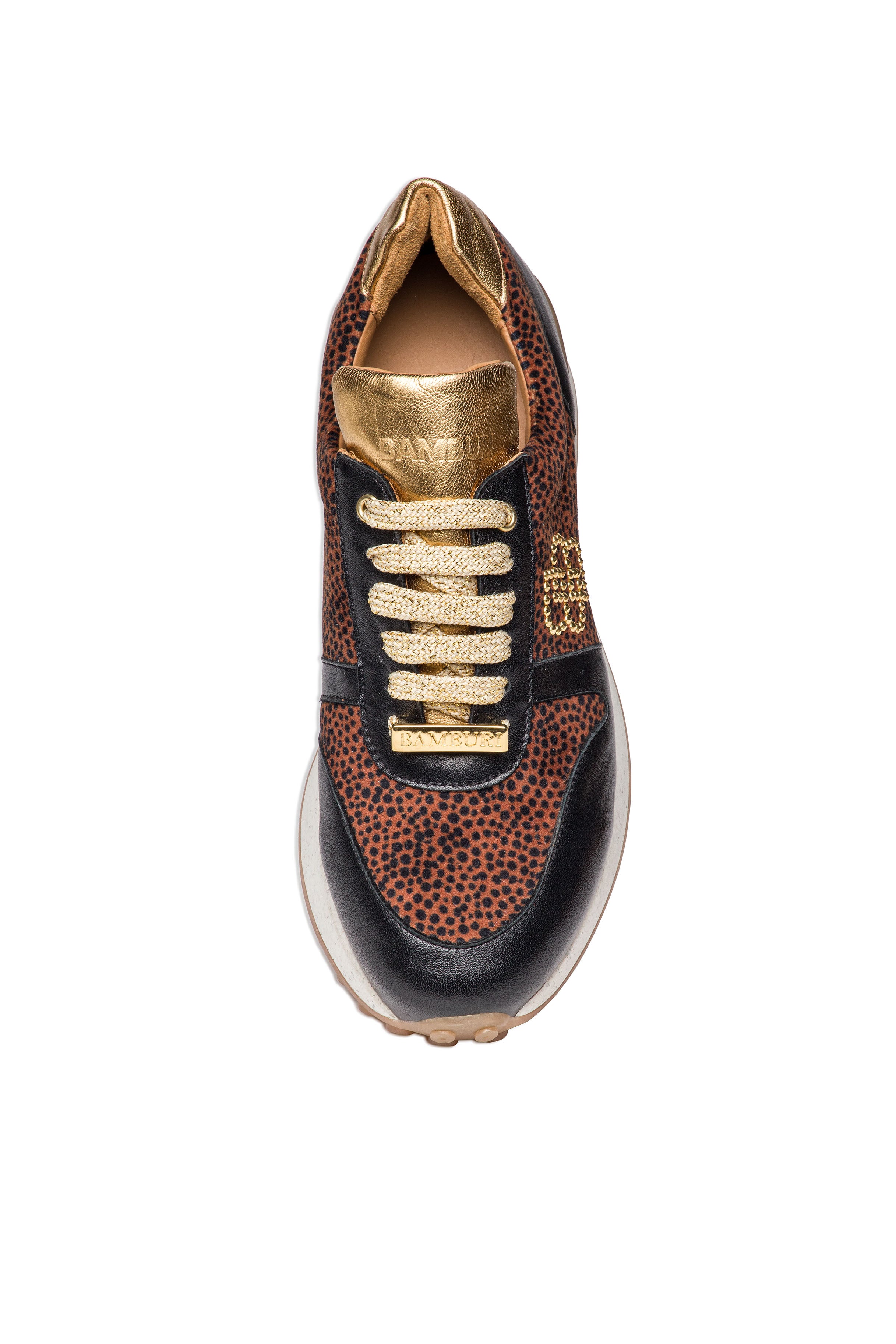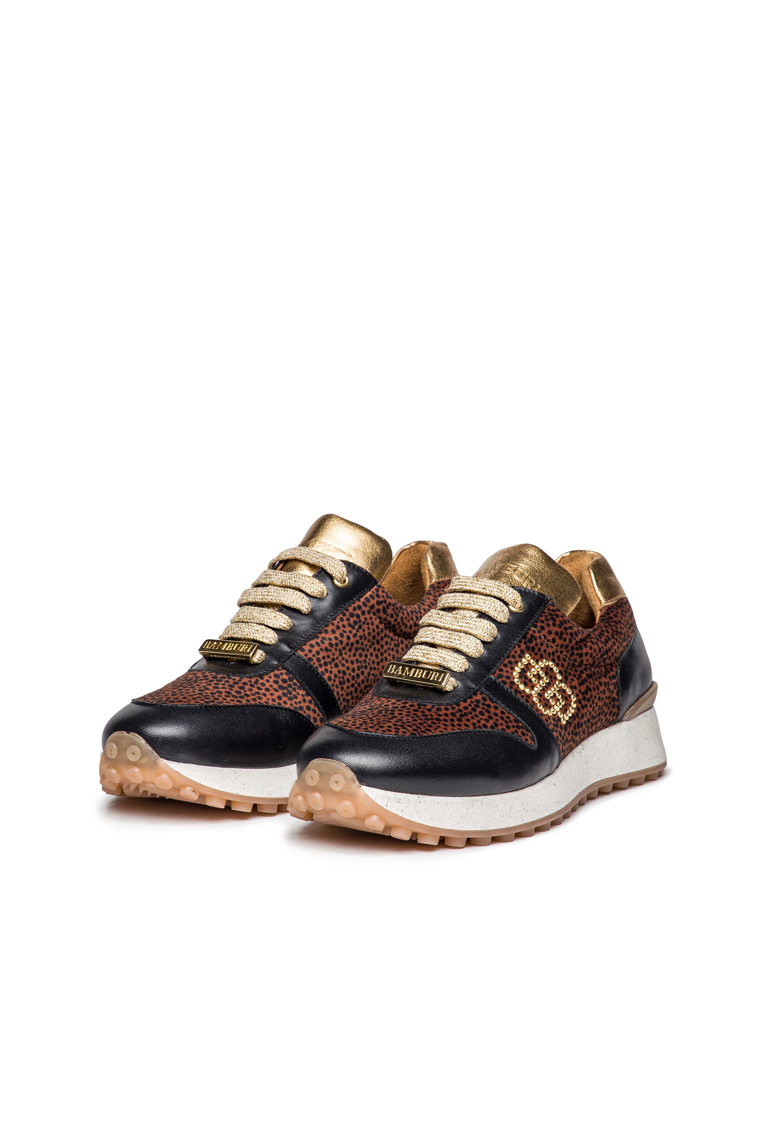 A bold sneaker blending luxury and sport, crafted in rich black leather with textured brown panels and shimmering golden details. Featuring metallic gold laces, a gleaming heel tab, and the signature Bamburi logo, these sneakers elevate any look with a statement of modern elegance and originality.