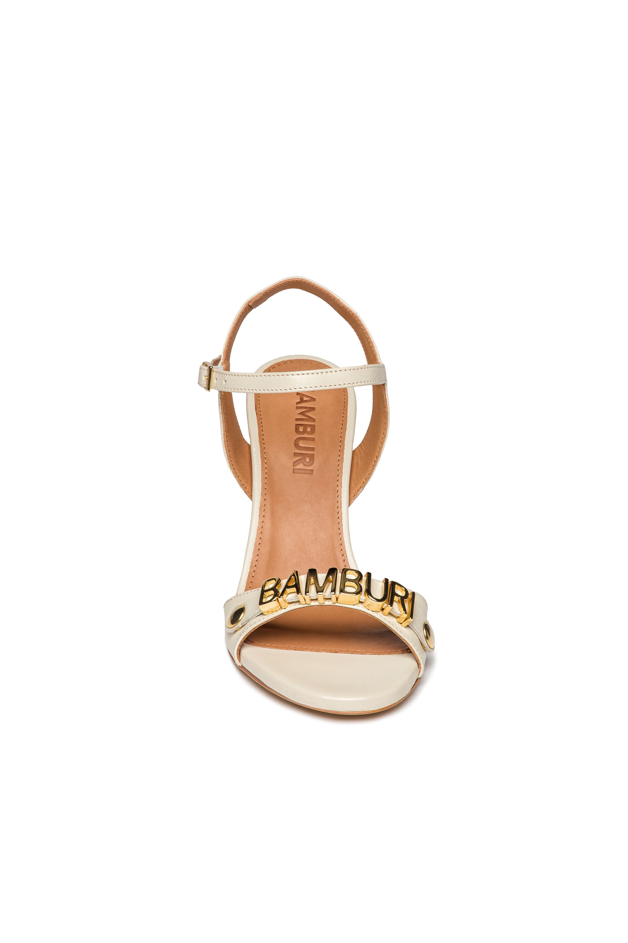 These elegant cream leather heels embody sophistication and boldness. Featuring a fine ankle strap with a gold buckle, their standout detail is the golden BAMBURI lettering across the front strap, adding a statement luxury touch. Set on a slender stiletto heel, they balance refinement with modern glamour, perfect for elevating both evening and chic daytime looks.