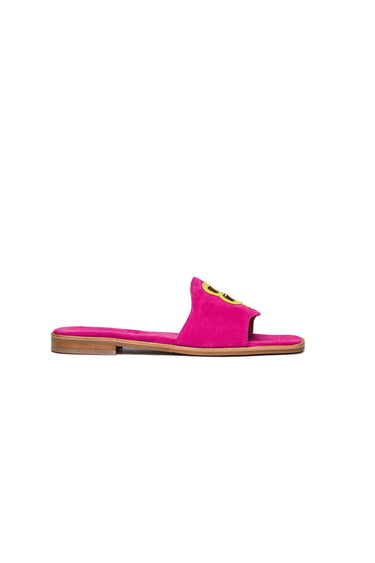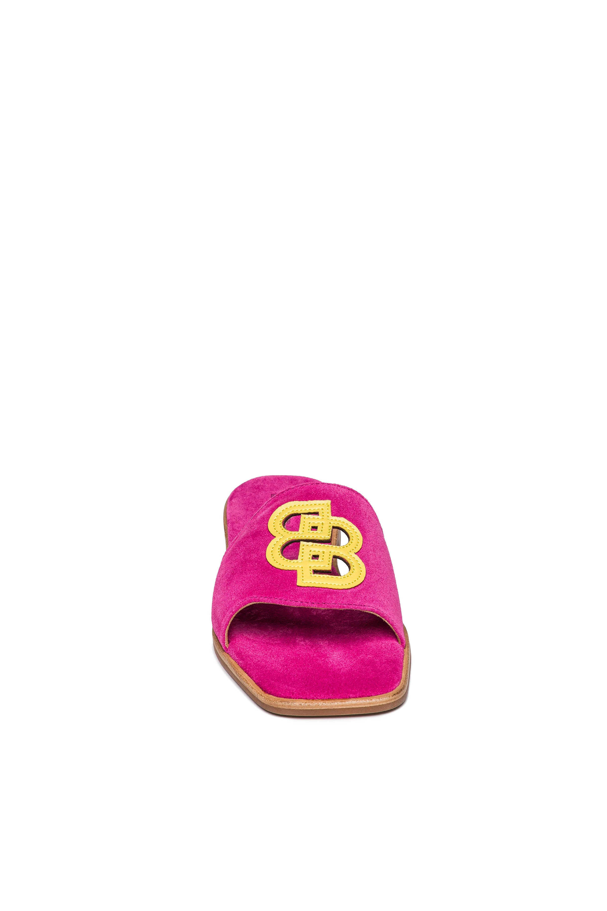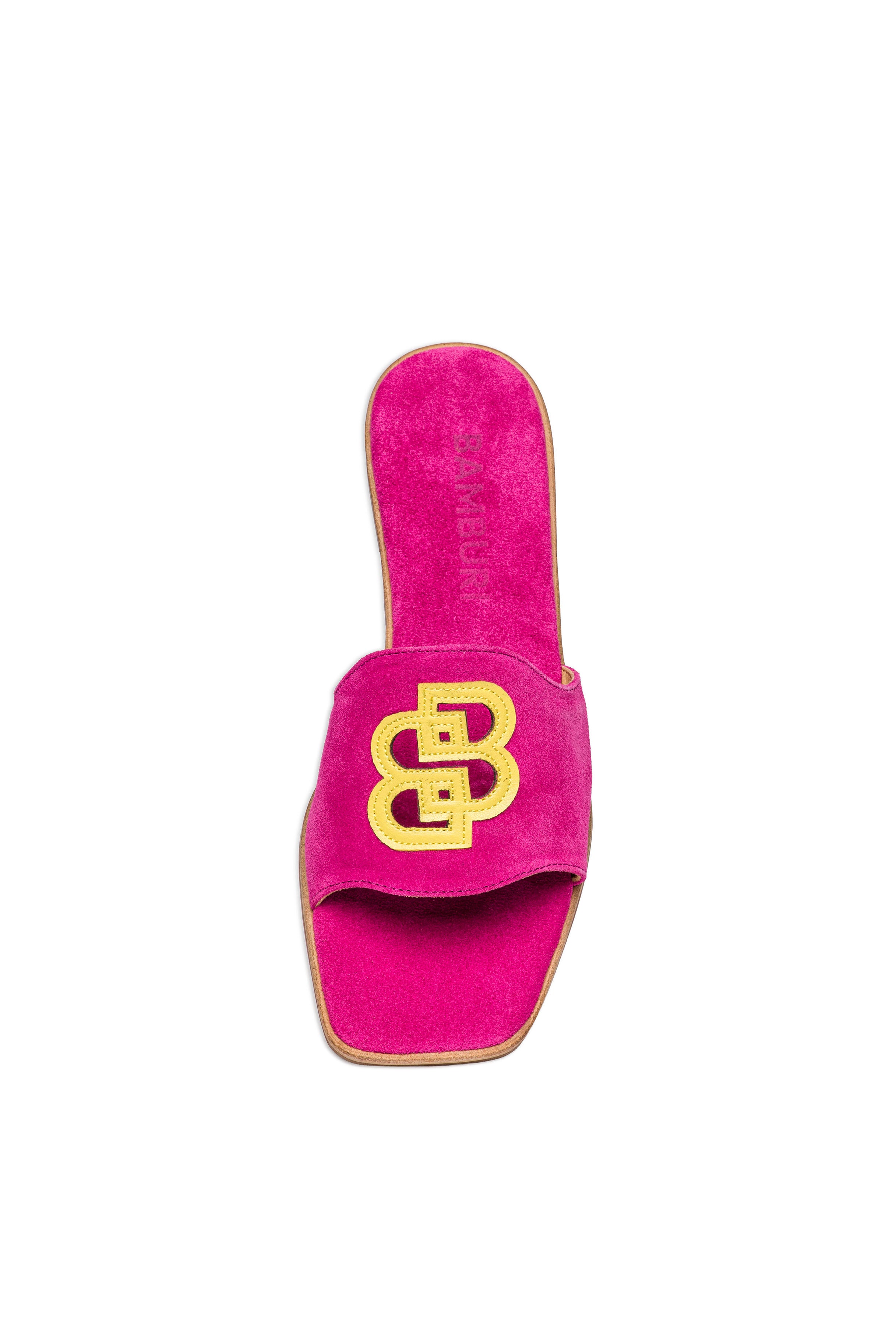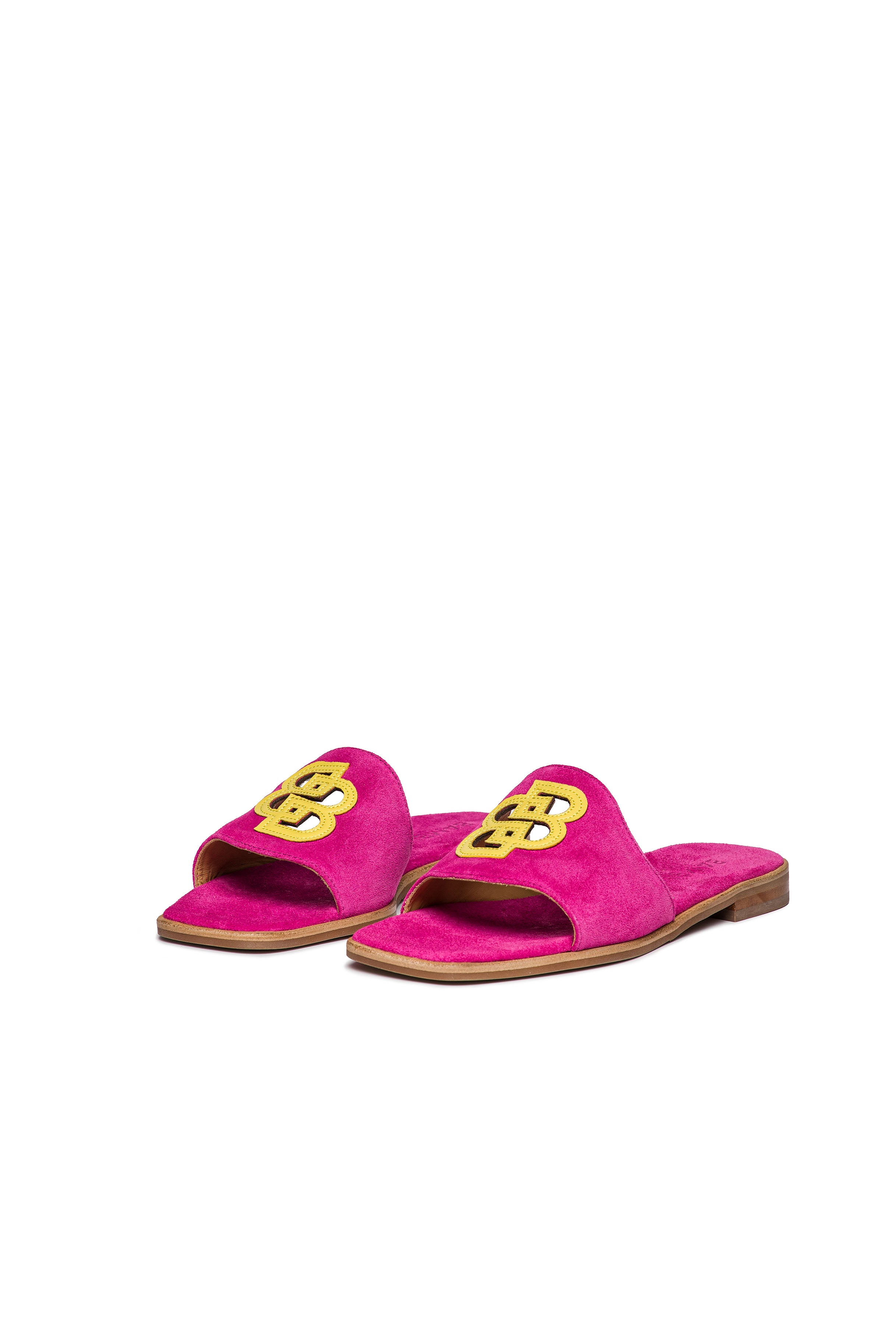 Bold and playful flat slides crafted in vibrant fuchsia suede. Featuring Bamburi’s signature BB monogram in contrasting yellow leather, these sandals add a statement touch to warm-weather looks. Designed with a sleek silhouette and comfortable leather sole, they pair effortlessly with casual denim or flowy summer dresses.