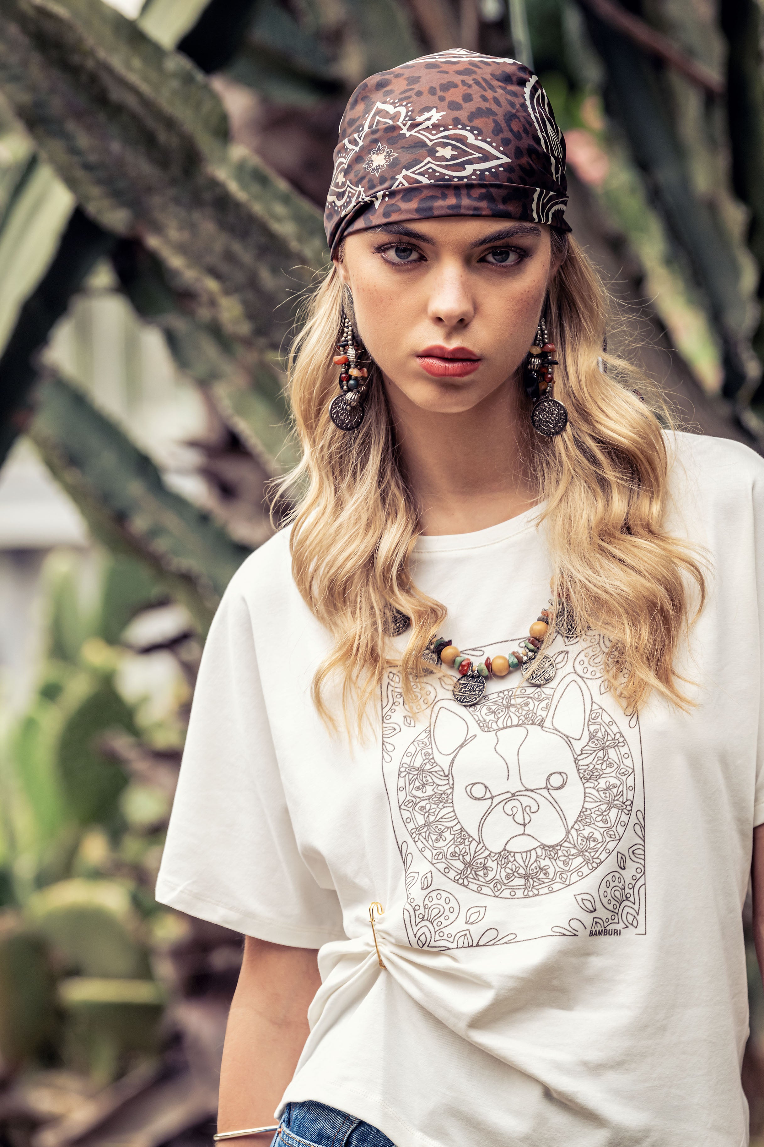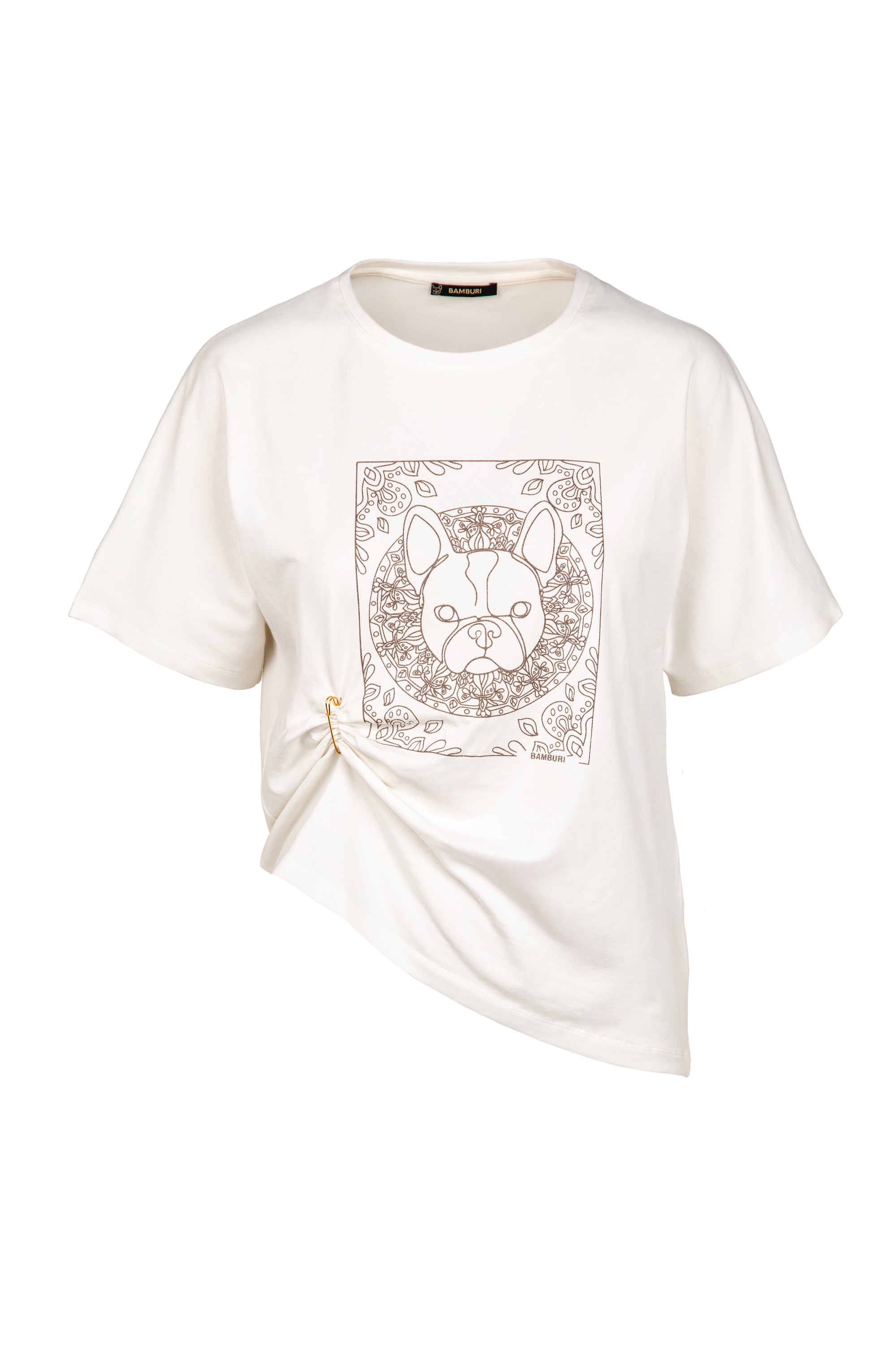 This off-white graphic T-shirt reinterprets a classic silhouette with a contemporary, asymmetric twist. Featuring a refined line-art dog illustration framed by a decorative motif, the design brings subtle artistic character to a clean, modern base. The side knot detail creates natural draping and a flattering, relaxed shape with a distinctive edge.