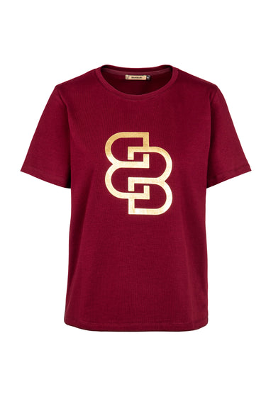 A bold yet refined essential designed to elevate everyday styling. This burgundy T-shirt features a striking gold monogram logo at the front, creating a strong visual identity with a clean, modern silhouette.