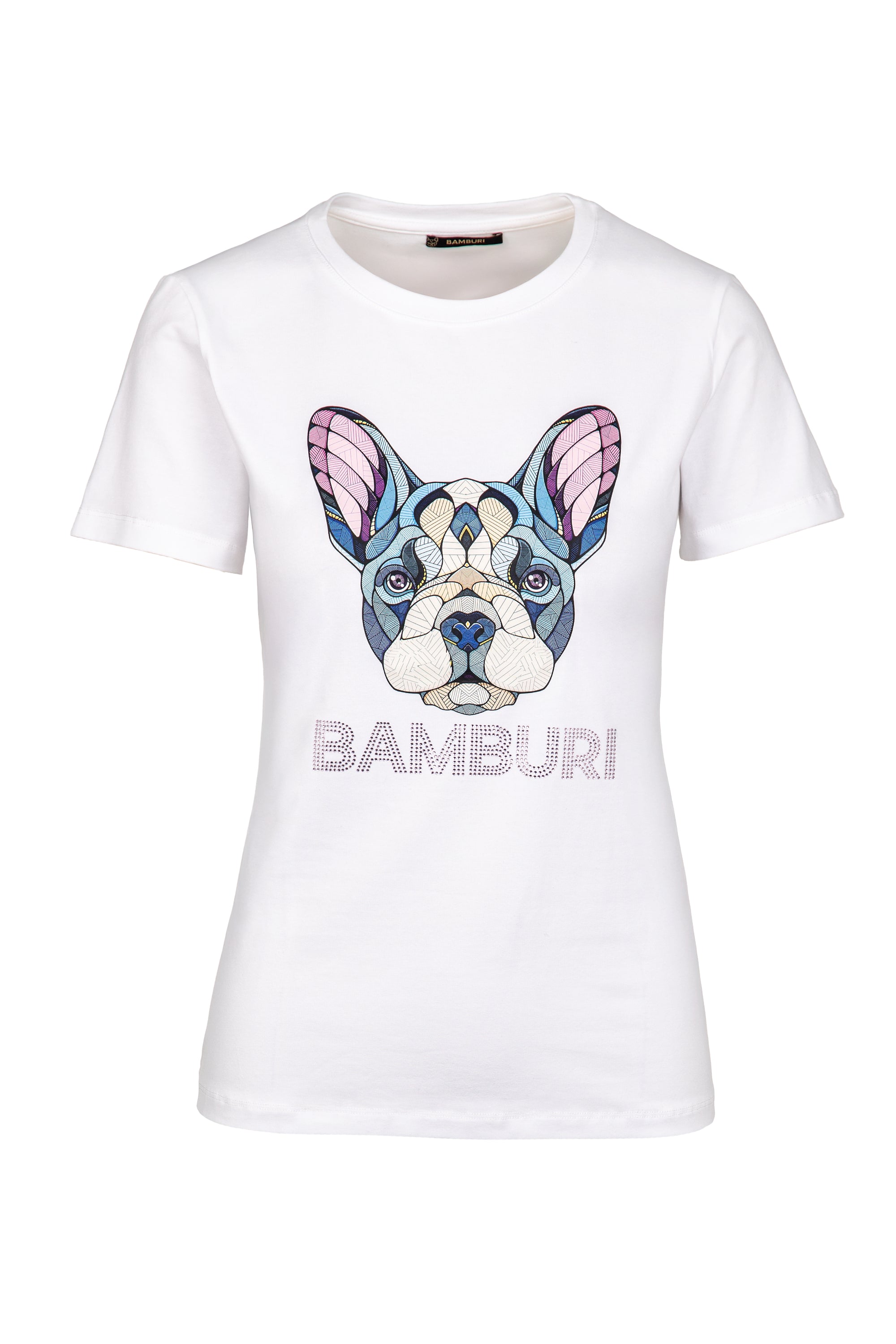 This white graphic T-shirt combines clean lines with a bold artistic statement. Featuring a stylised dog illustration in a mosaic-inspired design, it brings colour, personality and modern edge to an everyday essential. The crystal-effect logo detail adds a subtle touch of shine, elevating the look without overpowering it.