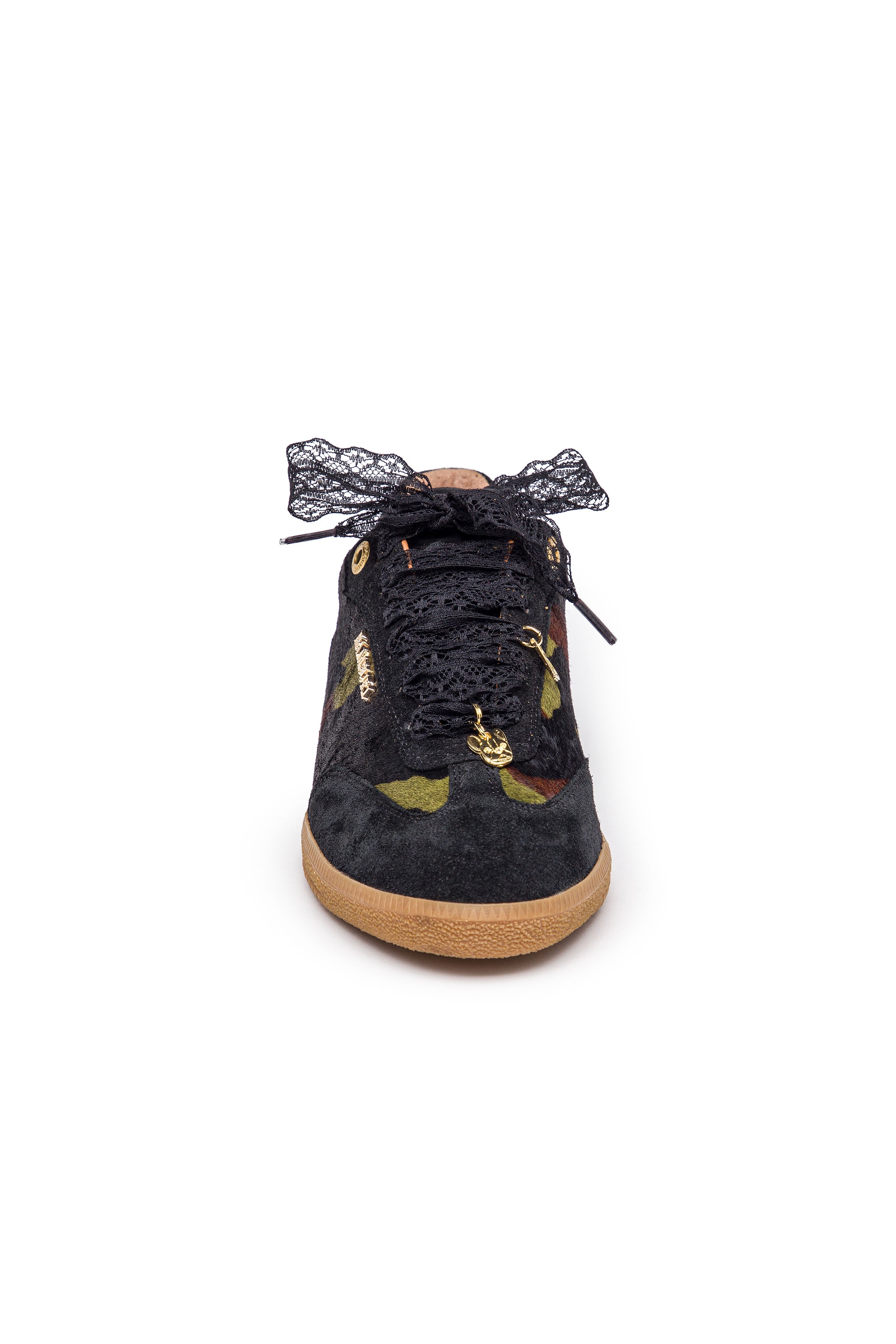 A daring mix of textures and attitude, these Bamburi sneakers are crafted in premium pony hair with a camouflage pattern and tonal suede overlays. Finished with lace-style laces, gold metallic accents, and signature Bamburi charms, they redefine street luxury with a feminine edge.